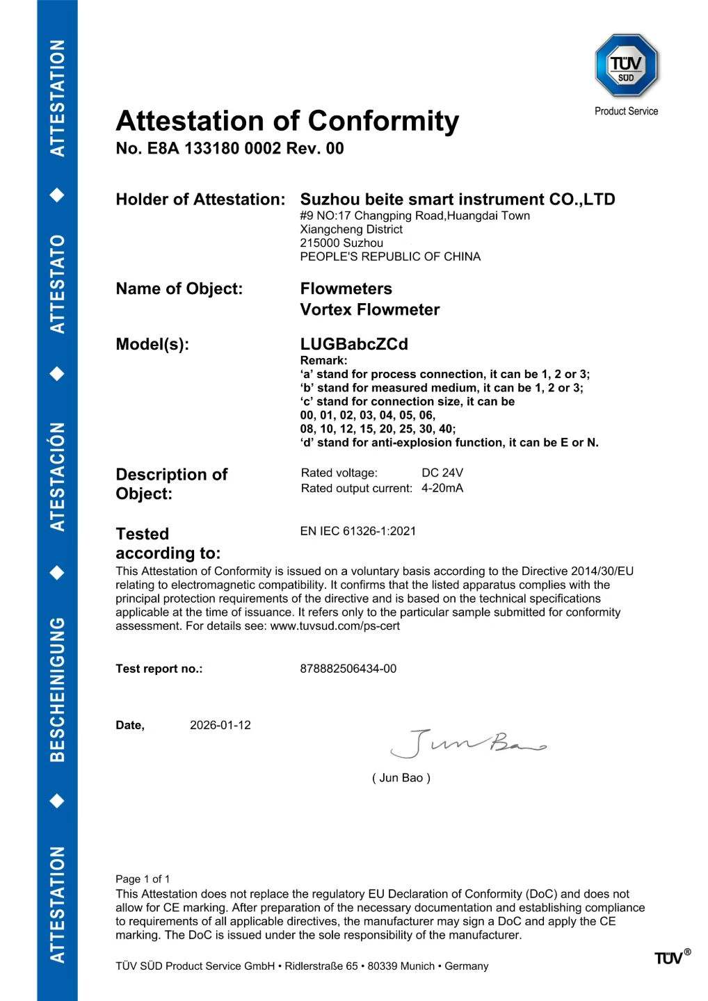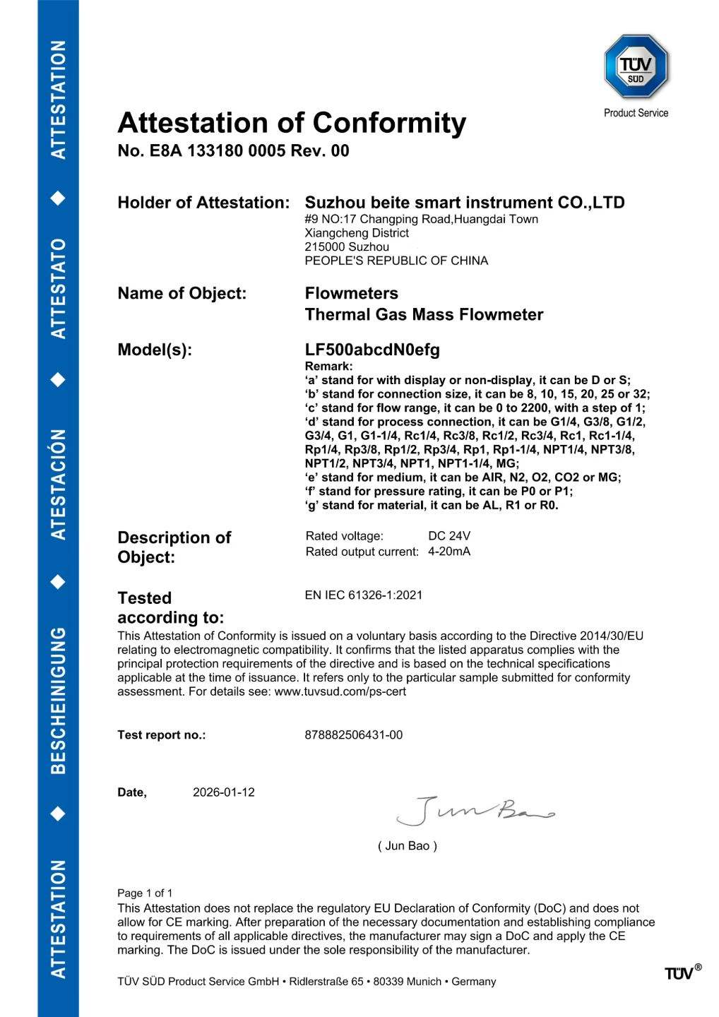 LF500 Thermal Gas Mass Flowmeter CE Certificate